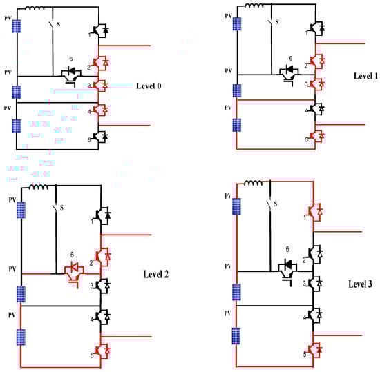 Switching sequence in this inverter is very simple. While selecting a particular switching pattern, make sure that switching transitions are minimum. There are six switching patterns to control the inverter. The sequence of switches (2-3-4), (2-3-5), (2-6-5), and (1-5) are used for levels 0–3, respectively. The output voltage will be the sum of voltage sources that are included in the current path. Current path for each level is shown in Figure 6 according to the above switching pattern.