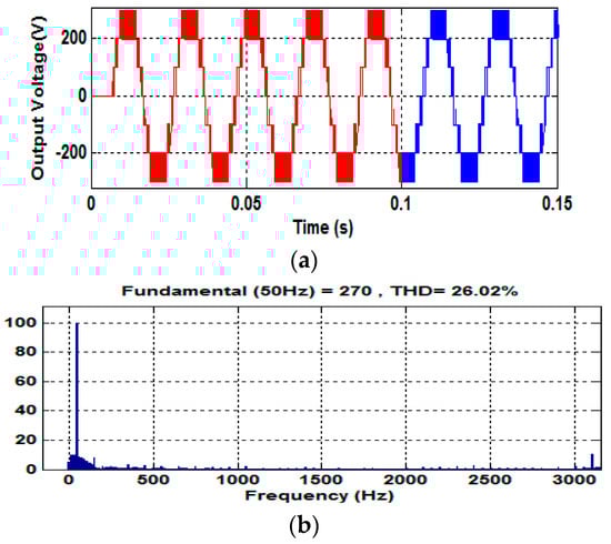 The simulated single-phase seven-level output voltage and harmonic spectrum with PWM is shown in Figure 8a,b.
