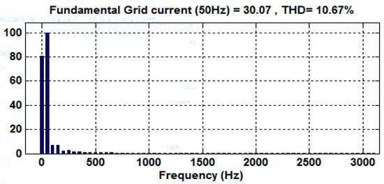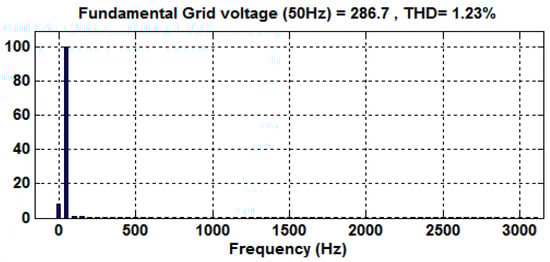 where Kp is the proportional gain tuned in the same manner as performed for a PI controller, and it mainly decides the dynamics of the system in terms of bandwidth, phase, and gain margin. The simulated harmonic spectrum analysis of output voltage and grid injected current is shown in Figure 17 and Figure 18, respectively. The THD values comply to the industrial standard and IEEE 519-1992 as the voltage harmonics are below 3% and the current harmonics are also less at PCC.