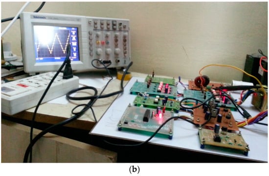 The hardware output for seven-level MLI is shown in Figure 20a and the whole prototype setup is shown in Figure 20b. The experimental hardware platform presents the MLI output. The grid synchronization in real time is achieved through zero crossing detectors (ZCD) with phase locked loop (PLL) circuitry.