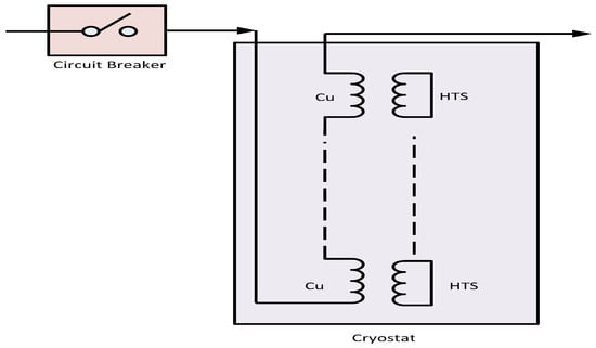 Resistive type SFCL can improve the transient stability of the power system by suppressing the level of fault currents in a quick and efficient manner [5,69,70,71,72,73,74,75,76,77,78,79]. A very simple structure of resistive SFCL is shown in Figure 5 consisting of nth units of stabilizing and superconducting resistances in parallel [5]. Coil inductance with nth units is connected in series with the parallel resistive branch.