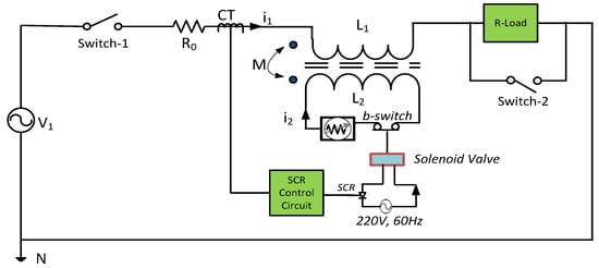 Enhancement of supply reliability and power system stability have been observed with the transformer type SFCL [52,62,63,64,65,66,67,68]. The primary side of the transformer type SFCL is connected in series with the load whereas the secondary side is connected in series with superconductors. The transformer type fault current limiter with vacuum interrupter is shown in the Figure 4. In Figure 4, L1 and L2 are the inductance in primary and secondary respectively. M is the mutual inductance between the primary and secondary coils of the transformer.