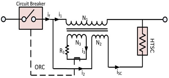 Among several of the SFCLs, the flux-lock type SFCL has less power burden of the high temperature superconducting (HTSC) element [53]. Short circuit current in power system can be limited with the flux-lock type fault current limiter during different contingencies [36,41,53,84,85,86,87,88]. The configuration of the flux-lock type SFCL with over current relay is shown in the Figure 7 where N1, N2, N3 and i1, i2, i3 represent coil-1, coil-2 and coil-3 and their currents, respectively. ORC stands for over current relay.