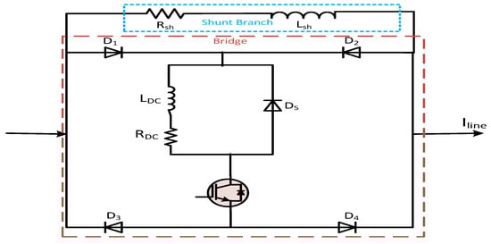 The main function of BFCL is to insert resistance and induction at the inception of a fault. It does not require superconductive characteristics for its operation, thus it has less application costs compared to other fault current limiting devices. The bridge part is composed of a diode rectifier, a very small dc limiting reactor (LDC), a small DC resistance (RDC), a commercially available semiconductor (IGBT) switch (CM200HG-130H) and a freewheeling diode. The main shunt branch is connected in parallel with the bridge part. It consists of a series of connected resistance and reactance (Rsh + jωLsh).