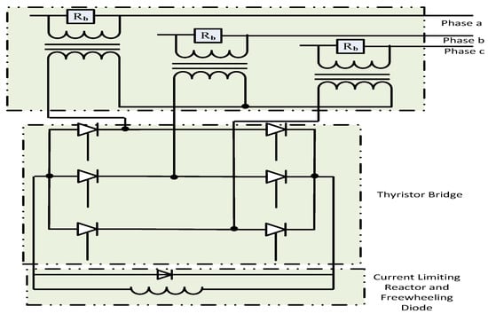 A transformer coupled bridge type fault current limiter is presented [105] for low voltage ride through (LVRT) capability enhancement of a doubly fed induction generator (DFIG). The schematic diagram of the fault current limiter is shown in Figure 12. A bypass resistor (Rb) is used to absorb the majority of the current harmonics during normal operation and to reduce voltage spikes.