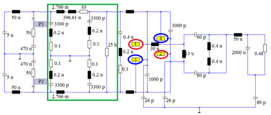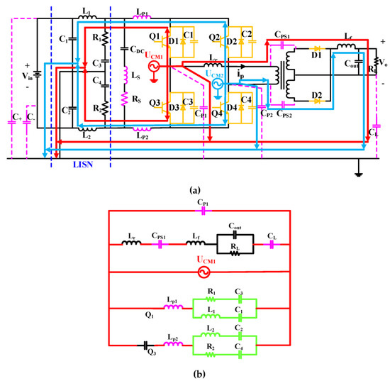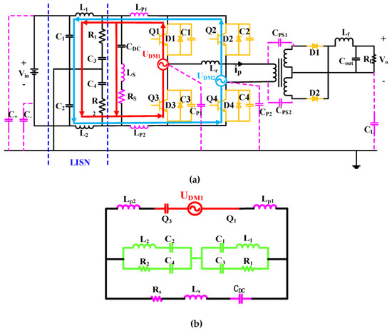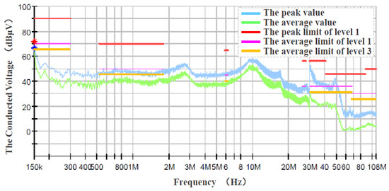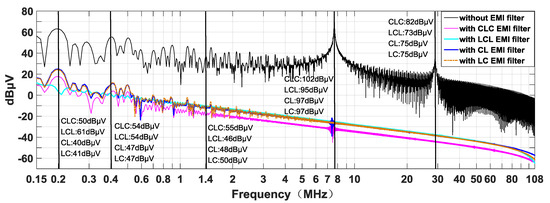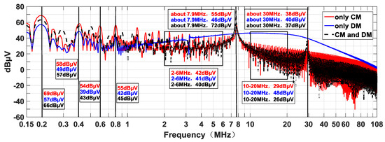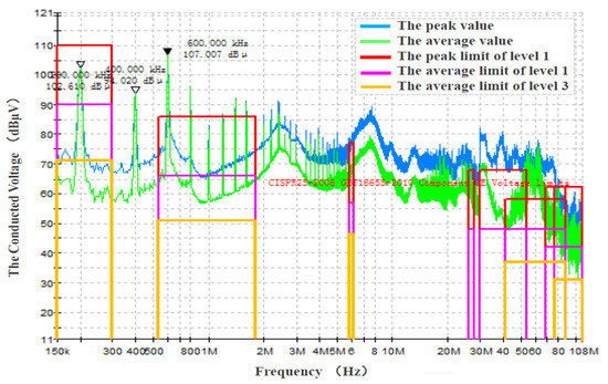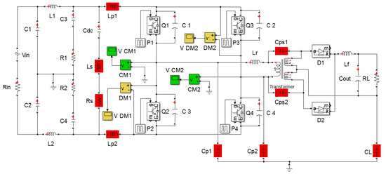 - Wang, Q.; An, Z.; Zheng, Y.; Yang, Y. Parameter extraction of conducted electromagnetic interference prediction model and optimisation design for a DC-DC converter system. IET Power Electron. 2013, 6, 1449–1461. [Google Scholar] [CrossRef]