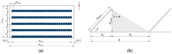 where is the module length, is the declination at the winter solstice (i.e., 23.45°) and is the latitude of the location (see Figure 2b). The number of PV modules per row , the number of PV rows and the total number of PV modules are calculated according to Equations (2)–(4), respectively.