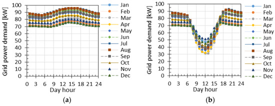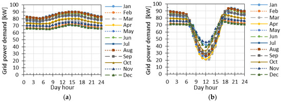 The typical daily profile of the grid power demand of each month of the optimal solution minimizing the grid electricity demand without PV is shown in Figure 8a. In this solution, the minimum and maximum values of the grid power demand range from 65.3 kW to 90.1 kW; these values are slightly lower than the respective values of the optimal solution of minimum yearly total cost without PV adoption.