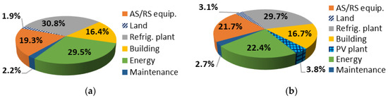 The yearly cost structure of the optimal solution minimizing the grid electricity demand when using a PV plant is shown in Figure 6b. In this case, the shares of energy and refrigeration plant costs are reduced to 21.7% and 29.7%, respectively, while the other cost shares are increased. In particular, the impact of the AS/RS equipment costs moves from 19.3 to 21.7% of the yearly total cost. This significant cost increase is mainly due the additional crane required to serve the second aisle.
