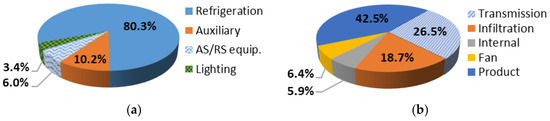 Figure 4a shows the structure of the electricity demand for the optimal solution of the reference case. The refrigeration equipment absorbs 79.2% of the electricity demand, thus representing the most energy intensive component of the refrigerated warehouse. The auxiliary equipment (i.e., fans) and the movement equipment (i.e., cranes, satellites, and trucks) use 10.1% and 8% of the electric energy demand, respectively. Electricity demand of lighting accounts just for 2.8% of the total energy required. The refrigeration load structure is reported in Figure 4b; we can observe that the product cooling covers nearly half refrigeration load, while transmission load and infiltration load represent 23.7% and 19.3%, respectively.