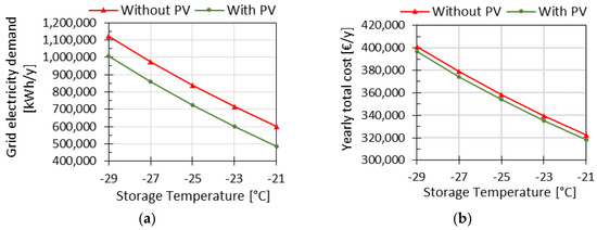 Regarding the temperature of the products entering the refrigerated warehouse, which depends on the upstream stages of the cold chain, the reference value of −15 °C has been lowered to assess possible energy savings. Figure 11a shows that the electricity demand from the grid can be reduced up to 37.3% when products enter a PV integrated storage facility at −21 °C, for a yearly total cost reduction of 10% (Figure 11b). If no PV plant is installed, instead (see red-colored features in Figure 11a,b) any variation at supply chain level required to preserve product quality leads to greater efforts both from economic and environmental perspectives.
