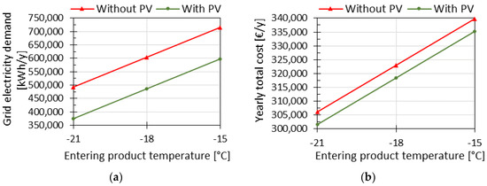 Sensitivity analysis on product temperature: (a) electricity withdrawal from the grid and (b) yearly total cost.