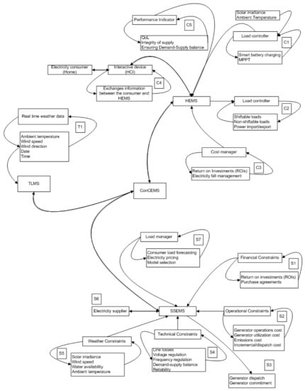 - S1–S7 for SSEMS (i.e., 7 constraints) where S1 is the financial constraint (fuel costs), S2 is the operational constraint (loading limits, reliability), S3 is the generator dispatch/commitment constraint, S4 is the technical constraint (voltage, frequency, var compensation), S5 is the weather constraint, S6 deals with specific constraints from the electricity supplier and S7 is the associated constraint from electricity users on demand response loads.