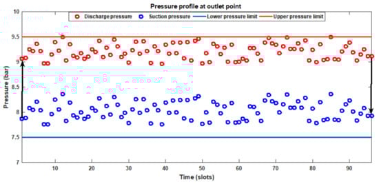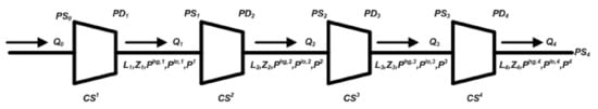 where is a compressor station, is a pipeline section, is the total time t cost of generation by all generators (US$), is the total cost of running all compressors at time t (US$), is the pipeline section compressibility ratio (dimensionless), is the pipeline section low pressure limits (bars), is the pipeline section upper pressure limits (bars), is the pipeline section pressure (bars), is the output pressure (bars), is the pipeline section gas flow rate (MMSCFD), is the total emissions cost at time t (US$), is the operations cost at time t (US$), is generator x emissions cost at time t (US$), is the discharge pressure (bars) from compressor , is the suction pressure (bars) for compressor , is the cost (US$/MWh) of generating by generator x at time t while every compressor station lies between pipeline sections and (i.e., ). Equation (2) presents the lower and upper compressibility limits for while Equation (3) describes the lower and upper pressure limits for . The possible range for the final discharge pressure is described in Equation (4) while Equation (5) presents the lower and upper flow rate limits for . The evaluation of , time t compressor cost, time t total emissions cost, time t emissions cost for generator x, compressibility ratio and time t operations cost is shown in Equations (6)–(11).