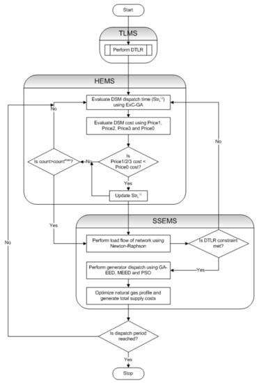 Figure 2 presents the case study network utilized for the application of the proposed ConCEMS while Figure 3 presents the gas network description. The case study network is an IEEE 30-bus network [28] which has been modelled as a closed system with 1 slack power bus (bus 1), 20 load points and 5 generation points. Each load point has both base loads and DR loads. The DR loads for each respective bus is made up of 10 clusters each of households with varying participation of DR loads. The slack power bus has been included to act as a sink/source for excess/deficit power. The test network consists of 41 lines used in moving power across the network. At the slack bus (bus 1), there are 3 generators—2 diesel generators (110 MW each) and 1 natural gas fired thermal generator (50 MW). The description of the demand side management (DSM) capabilities of the various load points is shown in Table 2 while Figure 4 presents the flow chart of the proposed working principle of ConCEMS. The description of the ConCEMS flowchart is as follows; after the computation of DLTR using hourly weather data, start time of DSM loads, is computed for all participating DSM loads. The cumulative of base load demand and DSM loads for each slot (15 min interval) is then used to optimally determine generation loading based on DTLR constraints for time . Load flow analysis is then done to determine the amount of power supplied from the slack bus and the appropriate costs. In computing , DTLR could place constraints that would necessitate power import through an alternate line p to meet and associated line losses. The computation of using ExC-GA is thus very important in determining the optimal that would reduce power supply costs and underutilization of generated power. In addition, the computation of associated supply side costs is followed by the computation of the cost of dispatching the DSM loads using hypothetical day ahead dynamic pricing models (Price1, Price2 and Price3) which are benchmarked with a time of use pricing scheme (Price0). This is to evaluate and determine the best dynamic pricing scheme that will ensure a reduction in DSM load cost, which is the incentive for placing the eventual dispatch of participating DSM loads under direct control by the utility. In computing the associated supply costs for the gas network, ConCEMS aims to generate the least cost for operating the compressors at the various compressor stations that will guarantee the required gas flow rate at the tapoff-point while maintaining the pressure, flow rate and compressibility values within the defined constraints across the length of the pipeline. In minimizing the supply costs for the proposed electricity network, emphasis is placed on the generators in bus 1. This is due to their large size which makes them the major supplier of the bulk load for the test network. The Newton Raphson (NR) method has been adopted in attempting to solve the resulting load flow problem. The modelling of the NR operation is constrained to ensure that convergence is only possible within allowed bus voltage limits. STT and SET for this research have been taken to be 00:00 and 00:00 + 1 day while all dispatch scenarios are carried out a day ahead.