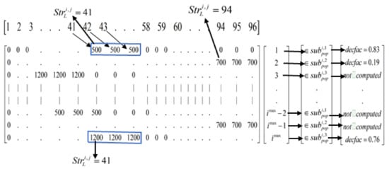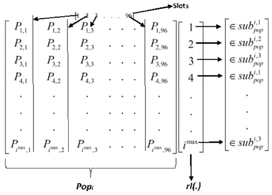 An initial matrix of dimension as shown in Figure 5 is created with all the values initialized to zero (i.e., ). Since three DSM loads per household are considered for this research, three sub-populations are created. The sub-populations created are filled with the row index of as follows: