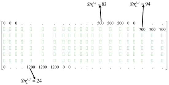 Thus, for the row L with and , then all elements in row L of are initialized to zero. A random start point is selected as with computed as shown in Equation (22). Next, the slots from to are filled with the respective as shown in Figure 7 based on the to which L belongs. The resulting is then summed column-wise to compute associated costs and violations if any.