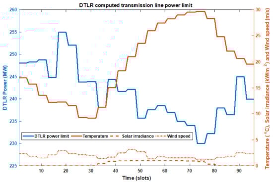 where is heat loss from convection; is the heating effect of the sun; is the AC resistance of the conductor at temperature and I is the conductor current. Out of the 14 inputs that Equations (12) and (13) depend on, five vary in real time–wind speed, wind direction, ambient temperature, time of the day and date. When these values are used without variation, Equations (12) and (13) result in STLR. For this work however, real time hourly data has been used for computing DTLR. The objective function of TLMS, is thus described in (14) as
