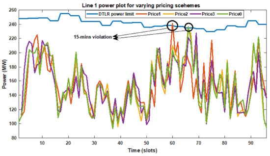 The variation of ampacity for the case study network based on DTLR computations is shown for a day in Figure 8. It is seen that power (MW) equivalent of ampcity has been used. Figure 8 shows that power limit computed based on DTLR varies from about 230 MW to about 255 MW per line across the day. The variation of power in Line 1 (between bus 1 and bus 2) for all pricing options is shown in Figure 9. It is observed from Figure 9 that 1 slot (15 min) TLMS violation occurs each for both Price1 and Price0 options with no TLMS violation for Price2 and Price3 options. Assuming 50% STLR (127.5 MW limit) and utilizing Price3, violation is observed for about 74% of the slots. Similarly, for 70% STLR (178.5 MW) and using Price3, violation is observed for 25% of the slots and 9.4% of the slots for 80% STLR (204 MW) and using Price3. ConCEMS thus adopts DTLR and ensures that the transmission network can be maximized in evacuating power without the need for any significant upgrades and without any violations.