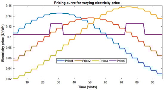 Four pricing schemes are adopted as ‘plug-ins’ in this paper—1 time of use (TOU) pricing (Price0) and 3 dynamic pricing schemes (Price1, Price2 and Price3). The adopted Price0 assumes a flat rate value of US$0.105/kWh across the day with a 20% increase between the hours of 6 am–8 am and 6 pm–9 pm. Price1, Price2 and Price3 are modelled such that their daily average value is US$0.105/kWh with Price1 having peak price between 6 am–8 am, Price2 has peak price between 11 am–1 pm and Price3 has peak price between 6 pm–8 pm. The mathematical description for Price0 is shown in Equation (30) while Equation (31) is the general description for Price1, Price2 and Price3. The pricing models adopted are hypothetical and aim at curtailing demand during their peak periods. The pricing signals are further communicated to consumers within each load cluster a day ahead to enable them schedule for their participating DSM loads. For the purpose of this research, day ahead pricing signals is assumed to be communicated by the utility to electricity consumers via their website. The implication of this is that electricity consumers participating in DLC are assumed to be literate and familiar with information technology (IT) devices for assessing such information. This is similar to the use of the Internet in providing electricity users day ahead pricing information by ComEd in [31].