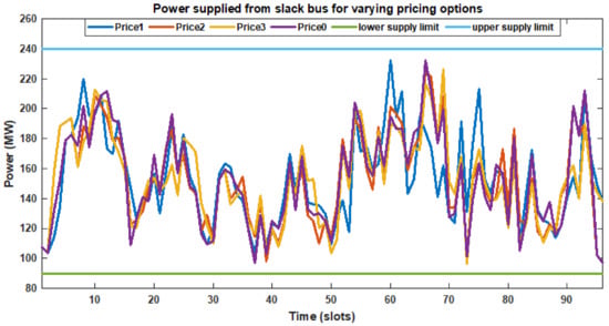 Figure 10 presents the various electricity pricing options adopted in this paper—Price1, Price2, Price3 and Price0 across the day While Figure 11 presents the total power supplied from the slack bus (bus 1) across the day. It is observed from Figure 11 that the total power supplied from the slack bus was within the limits set by the generators (lower limit of 90 MW and upper limit of 240 MW).