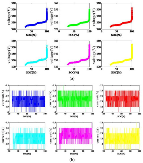 Moreover, to explore the impacts of charge voltage and current on charging processes, six sets of charging data were extracted to obtain the variation of voltage and current that increased with SOC, as shown in Figure 1.