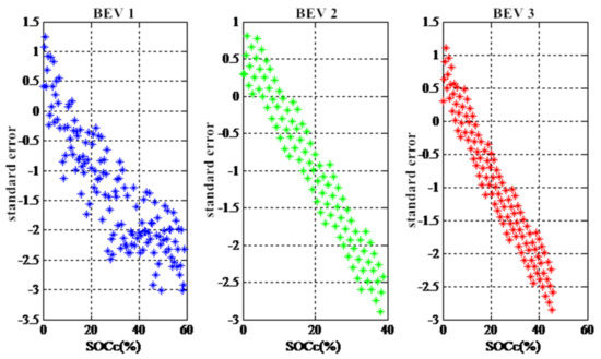 Figure 3 presents the standard error of charging time prediction. As shown in the figure, for the three BEVs, 65.5%, 79.6% and 82.6% of the standard error were found to be between −2 and 2, respectively. If the error follows the normal distribution, then approximately 95% of the normalised error between −2 and 2 should be found in the normalised error graph. The error of the charging time and the charged amount SOCc did not satisfy this condition. In other words, the error did not follow the normal distribution. Therefore, the model needs to be calibrated to obtain accurate predictions. The charged amount SOCc was regarded as a different observed point, and the corresponding error was the observed value of that point. The time-series method was applied to further modify the model.