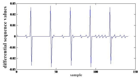 The second difference was determined as excessive difference (0.000469 > 0.000159). The first-order difference of the original sequence can eliminate its tendency. After eliminating the tendency of the original sequence, a three-step differential sequence was conducted to eliminate the cycle effect. Figure 6 presents a new sequence after the three-step differential sequence.