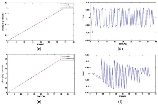 To further verify the error of the model, the mean error (EMean), root mean square error (RMSE) and root mean square relative error (RMSRE) were used as the indexes to test the model [28] on the basis of three sets of charging data not used for modelling. The results are shown in Table 5, where the mean error is less than 0.07, the root mean square error is less than 0.09 and the root mean square relative error is less than 0.016. In other words, the prediction error of the charging time was within 6 min. Therefore, the charging time model based on the charged amount SOCc can exactly reflect the actual charging process, which has quite accuracy and practicality.
