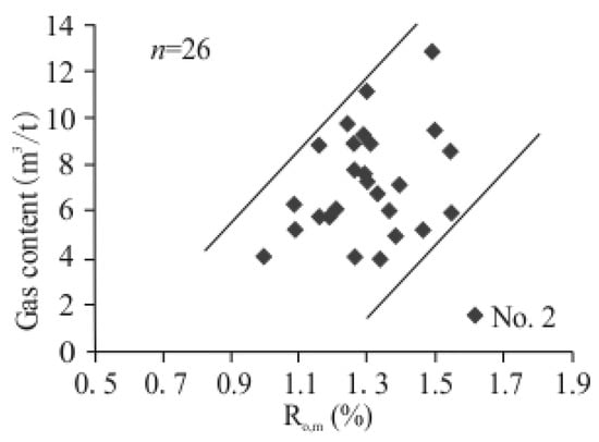 In the Gujiao area, gas content of coals from Nos. 2, 8, and 9 coal seams has positive relationships with coal metamorphism (Figure 10). The enlargement in micropores and specific surfaces from lignites to bituminous coals cause gas adsorption capacity of coals grow. Normally, the area with the maximum vitrinite reflectance indicates the CBM enrichment [12].