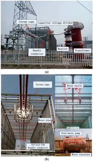 The UHV AC corona cage of the State Grid Corporation of China constructed in Xining (Qinghai, China) at an altitude of 2200 m, with a square cross-section (8 m × 8 m) and a total length of 35 m, was employed, as shown in Figure 1. The corona cage is composed of a 25 m long measuring section and two protective sections on each side of the measuring section, each being 5 m long. The corona cage is equipped with an artificial rainfall system, with which the corona characteristics of bundled conductors can be investigated under dry, rainy, and wet conditions. On the top of the corona cage, above the bundle conductor, four water pipes are arranged in parallel; for each water pipe, the rain nozzles are arranged at intervals of 10 cm. The rainfall intensity can be controlled by adjusting the feed pump motor frequency at the outlet to the water container. In the experiment, the rainfall rate, temperature, humidity, air pressure, and other meteorological data were recorded by weather stations (HOBO, Onset company, Massachusetts, USA) set around the corona cage, and the definitions of weather conditions were as defined in the IEEE Standards [17]. The test was carried out on a calm day without wind; first, the bundle conductor was tested under dry conditions; secondly, by adjusting the water intake in the pipe, the corona characteristic test of the conductor under different rainfall rate conditions was conducted to analyse the corona characteristics in moderate rain (rainfall rate of about 6 mm/h) and heavy rain (rainfall rate of about 12 mm/h); and finally, after the corona measurement test in heavy rain, in this case, the conductor surface was covered with water droplets, and the corona characteristics for wet conductors were measured.