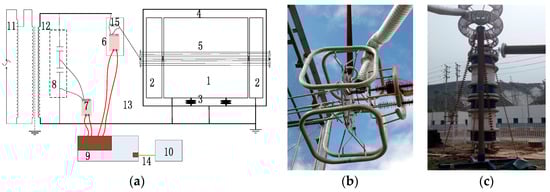 Measuring ends for current and voltage. (a) Sketch of the experimental platform: 1—Measuring section of the corona cage, 2—Protection sections of the corona cage, 3—Insulated support, 4—Shielding cage, 5—Test conductor, 6—Current measurement end, 7—Remote data acquisition module for communication at the voltage measurement end, 8-TRF-800 high-voltage standard voltage divider, 9—Local merging unit, 10—Host computer, 11—Voltage regulator, 12—Transformer, 13—Fibre-optic link, 14—Network cable, 15—Sampling resistor; (b) Current measuring end; (c) Voltage measuring end.