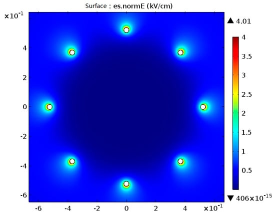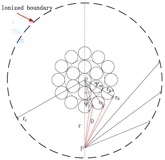 In this paper, the authors calculated the electric field strength E around the bundle conductors considering the outer strands based on the charge simulation method, as shown in Figure 6.