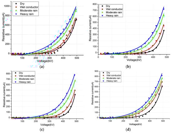 The resistive current curves of dry and wet 6 × LGJ720, 8 × LGJ720, 10 × LGJ720 and 8 × LGJ630 bundled conductors, as well as those in moderate and heavy rain, are illustrated in Figure 5.