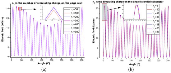 Figure 7a illustrates the electric fields on the walls of the corona cage calculated using different simulated charges, the computation error of the electric field between two adjacent calculation results is shown in Table 6; when the number of simulated charges on the corona cage exceeds 300, the electric field intensity of the stranded conductor remains unchanged. Figure 7b shows the calculated electric field distribution on the surface of the stranded conductor calculated by using different charges on each strand, the computation error of electric field between two adjacent calculation results is shown in Table 7; when the number of charges on a single strand exceeds 14, the calculated electric field on the strand surface remains unchanged. Therefore, 17 simulated charges were applied to each strand of the outer strands of sub-conductors for these simulations, and 400 simulated charges were applied to the corona cage wall. In this way, the electric field on the surface of the stranded conductor was determined.