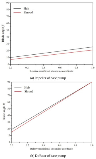 where x denotes the relative meridional streamline, and values of 0 and 1 represent the leading edge and trailing edge, respectively. β0 is the blade angle at the leading edge, and ∆β = β1 − β0 is the difference between the blade angle at trailing edge and the leading edge.