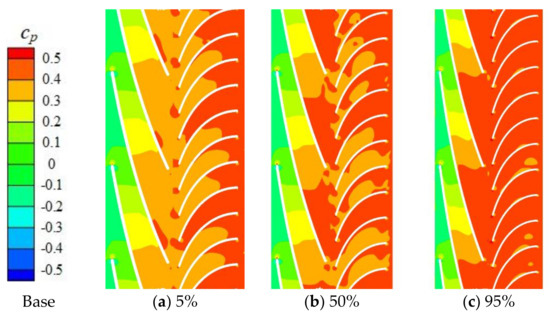 Figure 11 shows the distribution of pressure coefficient cp at sections of 5%, 50% and 95% blade height inside base pump and optimization pump. The pressure coefficient is defined by cp = (p − pinlet)/(0.5 × ρl × u22) to normalize the pressure, where pinlet is the pressure at pump inlet, ρl is the liquid density, and u2 is the circumferential velocity at impeller outlet. As shown in Figure 11, a higher pressure appears at the impeller outlet of optimization pump, which indicates that higher energy has been transferred to the working fluid. The partially high pressure region at the suction side of base pump is eliminated in optimization pump.