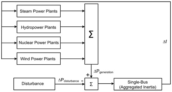 The power system model shown in Figure 1 is a single-bus representation and adopted from the PEGASE benchmark pan-European model [16]. The PEGASE benchmark model represents the behavior of European power systems during the disturbance that occurred on 4 November, 2006 [17,18]. The disturbance caused cascading events, leading to a split of the European system. After the split, one area (the northeast part) had 10% wind power generation with reduced inertia. The benchmark model is adopted considering this kind of wind-rich area as an initial case by implementing general purpose governor models [19] for each type of conventional power plant. The aim of this benchmark model is to incorporate power system characteristics with reduced inertia and high wind power penetration, for instance, out-of-range contingencies (i.e., split incidents) in large interconnected power systems and normative contingencies in islanded power systems (e.g., Ireland or UK). The benchmark model is implemented with a mix of generating units including steam, nuclear, and hydro power plants as well as WPPs. Accordingly, starting with 10% wind power penetration, high penetration levels are introduced up to 50% by displacing steam and nuclear power plants. These wind power penetration levels, in terms of generation shares, are given in Table 1. Penetration level is defined as the ratio of wind power generation to total power generation. For the simulations to establish the impact of low inertia on system frequency, the frequency contingency event is modelled as a disconnection of the largest infeed. It should be noted that the single-bus representation provides average frequency value; however, it does not consider fast frequency transients and generator speed oscillations.