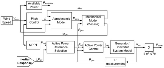 The common practice for modelling WPPs is to aggregate generic VSWT models as a single unit with a required level of accuracy and details relevant for power system integration studies. VSWTs, which have partial or full-scale power electronic interfaces, are considered in this study due to their highly present installed capacity and impact on frequency stability. Generic models of VSWTs and WPPs have been developed recently in North American Electric Reliability Corporation (NERC), Western Electricity Coordinating Council (WECC), and International Electrotechnical Commission (IEC) standards [20,21,22] with an aim to represent the behavior of VSWTs for short-term stability studies. As these models do not include wind speed variability or aerodynamic features, they are not appropriate for frequency support investigations such as SIR. In [23], an extended version of the IEC 61400-27 model is introduced, including wind speed variability, a simplified aerodynamic model, its coupling to the mechanical model, which is essential to adequately account for the dynamics and limits of generator speed. With this extension, the model can be further used in the investigation of SIR [3]. In the present paper, the aggregated and extended version of the IEC 61400-27 model described in [23] and depicted in Figure 2 is employed to represent the active power control, mechanical, and aerodynamic performance of WPPs during their SIR contribution. Note that reactive power, voltage control, inner current control, and DC-link dynamics are neglected in the WPP model, as the focus in this work is on the active power control of WPPs. Accordingly, the active power increase does not affect operating conditions of voltage/reactive power and DC voltage control. Electrical and mechanical limitations, such as ramp-up and ramp-down limits, minimum generator speed, and maximum power/current limits, are included in active power reference selection, active power control, and generator/converter system blocks (Figure 2). During SIR support, it is assumed that the active power increase does not violate the DC-link voltage limits in the VSWT, and the DC capacitor capacity is sufficient. The aggregation assumption considers identical VSWT dynamics, control structure, and wind speed input. Additionally, internal losses inside the WPP are neglected. Different constant wind speed cases are simulated for the SIR optimization during each individual case.