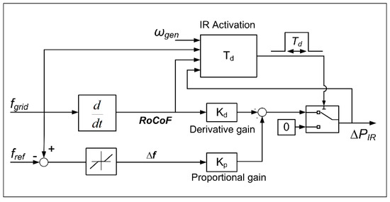 The SIR control scheme implemented in this paper is illustrated in Figure 3. It is frequency-dependent with utilization of the kinetic energy from the VSWT rotor without the need for power reserve for below-rated wind speeds and use of the excess wind power for above-rated wind speeds. This control approach is adapted from [7] with the addition of an activation functionality, which can determine the duration of the response (Td) following a frequency event. The activation functionality includes grid-event detection with a switching logic to enable/disable the active power output (∆PIR) for duration Td. Inputs of the activation function are frequency measurements (fgrid and RoCoF), VSWT generator speed (wgen), and ∆PIR. f and RoCoF are used to detect the frequency event when the predefined threshold values are exceeded. Accordingly, SIR should not be activated for small frequency deviations, to not mechanically stress the VSWT. After detection of the event, the Td parameter defines the duration of the response. Finally, wgen is employed in the activation function as the mechanical limitation of the turbine to keep the operation above the minimum generator speed. As can be seen from this implementation in Figure 3, there are three parameters to be tuned for the provision of SIR: the derivative gain (Kd), the proportional gain (Kp), and the response duration (Td).