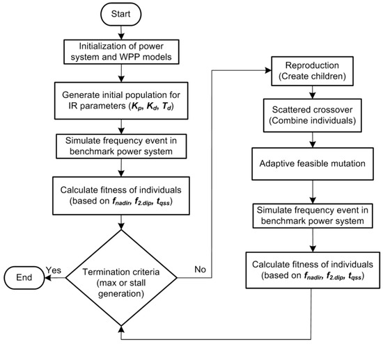 Flowchart of genetic algorithm (GA) for optimization of synthetic inertial response.