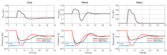 The optimal parameter sets for medium and high wind speed regions are very similar. The simulation results based on these optimal parameter sets are presented in Figure 6 for 7 m/s, 10 m/s, and 14 m/s wind speeds. These representative wind speeds are selected in order to compare the three regions. The base case in Figure 6 represents the power system frequency response without SIR at 50% wind power penetration. The behavior of WPPs after approximately 5 s creates a second frequency dip in both medium and high wind speed cases for different reasons. In the medium wind speed case, the recovery period causes a drop in active power output. However, in the high wind speed case, due to the high Kp parameter, SIR contribution indicates high active power output around the frequency nadir. Therefore, the reason is not the existence of the recovery period, but the drop in active power output of the WPP after the frequency nadir. Actually, the ramp-down rate of this drop is the main reason for the second frequency dip. As mentioned earlier, the operating region close to the rated wind speed cannot provide sufficient support to prevent load-shedding action at 50% wind power penetration (Figure 6, 10 m/s case).