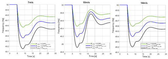 The optimization results presented in Table 2 were obtained for a single contingency, the loss of the largest infeed (Ploss_max) as a possible (N-1) criterion. According to the (N-1) criterion, the rest of the components in operation can accommodate the new quasi-steady state after the occurrence of the contingency without violating operational security limits. With the same simulation setup used for Figure 6, the contingency to create the frequency contingency event was varied in percentage of Ploss_max as 50% and 75%. The purpose of this sensitivity analysis was to verify that the optimal parameters of the largest contingency would not cause any inconsistency in the frequency response regarding the uncertainty of contingencies. Since the contingencies cannot be predicted in advance, it is feasible to take into account different contingencies for the same set of parameters. Simulation results are given in Figure 7 for wind speeds of 7 m/s, 10 m/s, and 14 m/s. It can be observed that the frequency deviation is reduced, and accordingly the optimized SIR parameters do not create any instability or deterioration in system frequency. These results can actually be further analyzed by TSOs applying their planning and operation experience. If optimization is performed for each contingency, different parameters can be obtained, and TSOs are responsible for deciding on the parameter ranges for WPPs based on these contingencies. Based on these results, the largest infeed loss, which is decided by the experiences or design values of TSOs, can be considered for selection of SIR parameters. Additionally, with more detailed investigations, quantification of SIR can be realized accurately by considering occurrences of different contingencies in the power system.