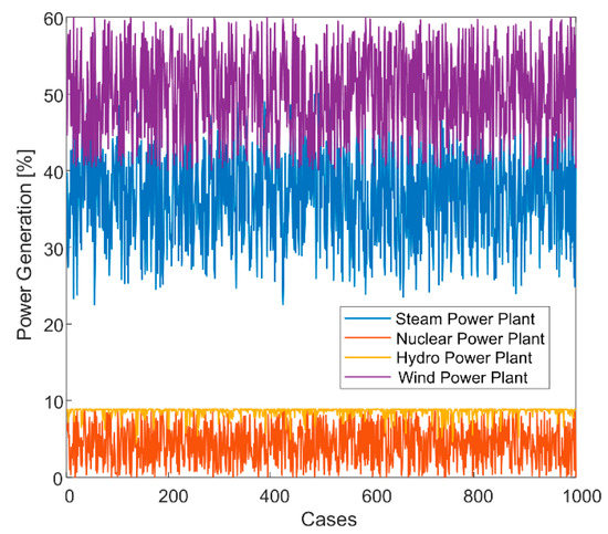 In order to realize different wind power penetration levels, 1000 cases were implemented by randomly varying generation shares of steam, nuclear, and hydro power plants. These cases are given in Figure 8, and the total generation remains the same in all the cases. Eventually, wind power generation is varied within 40% and 60% penetration levels. By simulating these variations, the total primary frequency control contribution from conventional power plants is modified, and thus different frequency control performance is represented in the benchmark power system. Accordingly, the total inertia of the power system is altered depending on the generation share. Similar to the previous sensitivity analysis, three wind speeds (7 m/s, 10 m/s, and 14 m/s) were simulated in these wind power penetration levels to analyze the impact of WPP capability. This sensitivity analysis includes assessment of two factors, wind speed and wind power penetration level. The combination of these two factors is very important when designing and tuning SIR from WPPs.