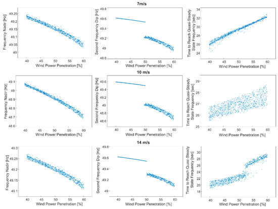 The third objective in the objective function, time to reach the quasi–steady-state frequency (tqss), increases with increased wind power penetration (Figure 9, right column). For 10 m/s wind speed, the impact of the optimized parameters causing this increase is not significant, since the SIR contribution is limited. However, 14 m/s wind speed at high wind power penetration levels (approximately above 52%) causes a jump in tqss due to the impact of the second frequency dip. According to the analysis results, these settling times in all of the cases can be acceptable, since they are around 30 s, which is the goal set value for tqss.