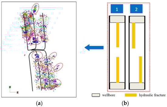 Figure 1 illustrates the WIPS schemes in a tight oil reservoir. The whole oil field can consist of several independent WIPS scheme. Although every WIPS scheme also can interfere with each other when the wells produce enough long time, in this paper, we mainly focus on WIPS within one WIPS scheme at the early-intermediate production period. Each WIPS scheme contains several SMFHWs which produce using same platform. Figure 1a,b illustrate the micro-seismic surveillance within one WIPS scheme and the corresponding idealized scenarios of hydraulic fractures.