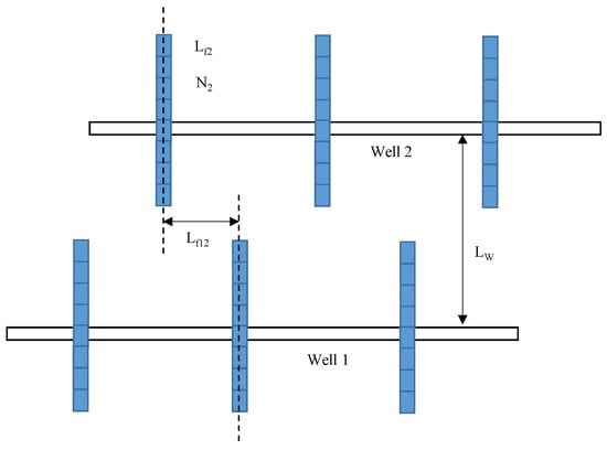 As shown in Figure 2, for well1, the fracture permeability is kf1, the fracture width is wf1, the fracture half-length is Lf1. For well2, the fracture permeability is kf2, the fracture width is wf2, the fracture half-length is Lf2. The distance between two well is Lw. the distance of two hydraulic fractures is Lf12. To establish a mathematical model, we first subdivide the HFs systems of WIPS scheme. We assume that each hydraulic fracture of well1 is divided into N1 sub-fracture segments, each hydraulic fracture of well2 is divided into N2 sub-fracture segments. The hydraulic fracture number of well1 is M1. The hydraulic fracture number of well2 is M2. The length of each fracture segment for well1 and well2 can be presented as ΔLf1, ΔLf2, respectively. We can summarize fracture properties as follows: