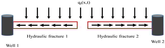 In order to describe our method conveniently, we chose two SMFHWs for our research purpose. However, our approach can be easily extended to more than three SMFHWs WIPS scenarios. Two SMFHWs produced at constant oil rate q1 and q2. Fluid flows into HFs from tight oil reservoir and is assumed to qf. In addition, there are some other assumptions as follows: