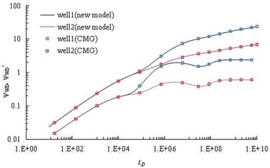 In this section, we will mainly focus on identifying the MWPI phenomenon based on the special characteristic of pressure response curves. Common parameters were set for those two wells: M1 = 3, M2 = 3, ζD = 0.05, λ=0.002, γ = 0.15, ω = 0.0035, CηD = 105. Setting consistent fracture properties (conductivity and half-length) Lf1D = LfD2 = 200, Cf1D = Cf2D = 10. Another two parameters, LwD and Lf12D, can be mathematically described as follows: