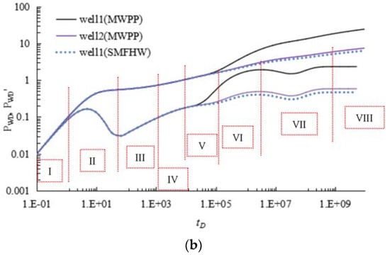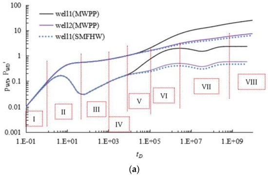 Regime VI: The intermediate-time linear flow regime. This stage is mainly dominated by wellbore length. At this intermediate-time linear flow regime, we also can detect the MWPI for type Figure 1b (1) and Figure 1b (2). The slope of the DPD curves is actually bigger than 0.5. The distortion degree of pressure curve for small oil rate is more significant that that of big oil rate.